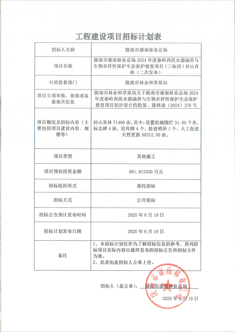 隴南市康南林業(yè)總場(chǎng)2024年度秦嶺西段水源涵養(yǎng)與生物多樣性保護(hù)生態(tài)保護(hù)修復(fù)項(xiàng)目(三標(biāo)段)封山育林(二次發(fā)布)