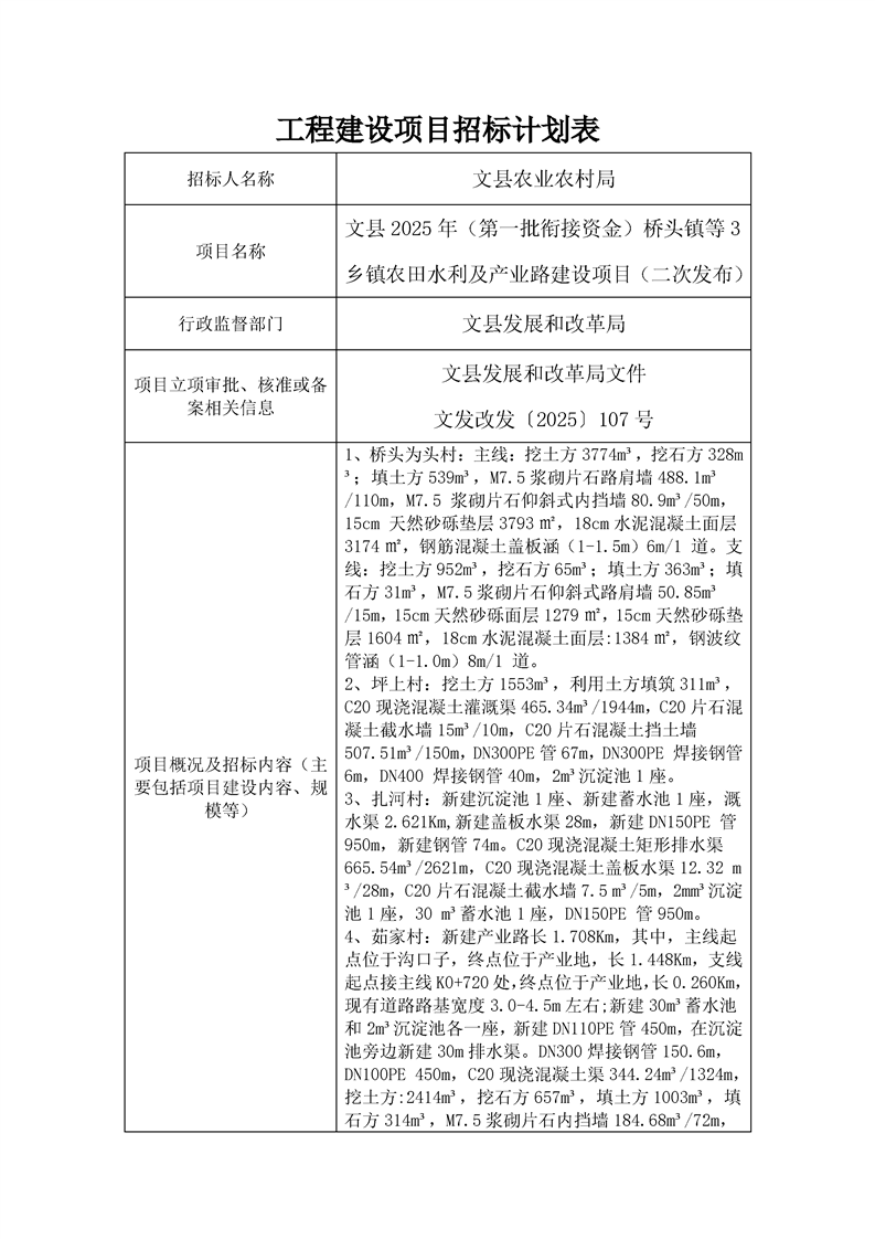 文縣2025年(第一批銜接資金)橋頭鎮(zhèn)等3鄉(xiāng)鎮(zhèn)農(nóng)田水利及產(chǎn)業(yè)路建設(shè)項目(二次發(fā)布)