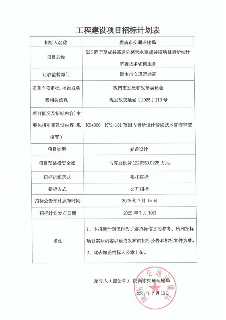 S25靜寧至成縣高速公路天水至成縣段項目初步設計審查技術咨詢服務