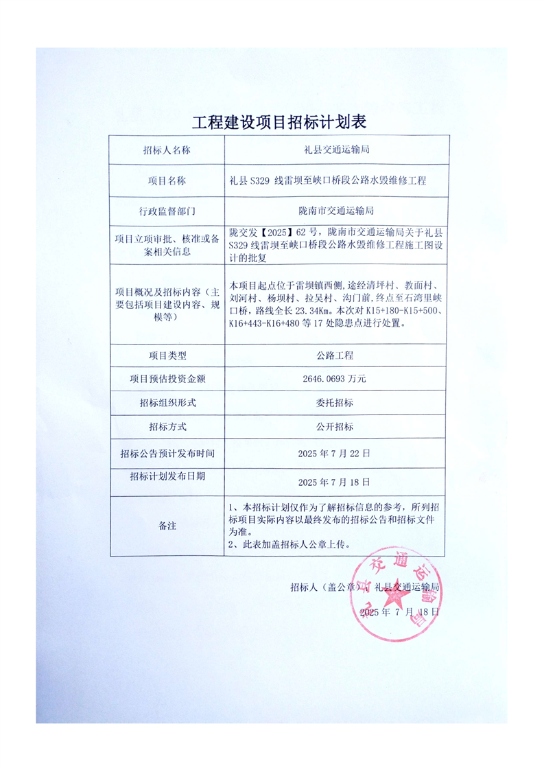 禮縣S329 線(xiàn)雷壩至峽口橋段公路水毀維修工程