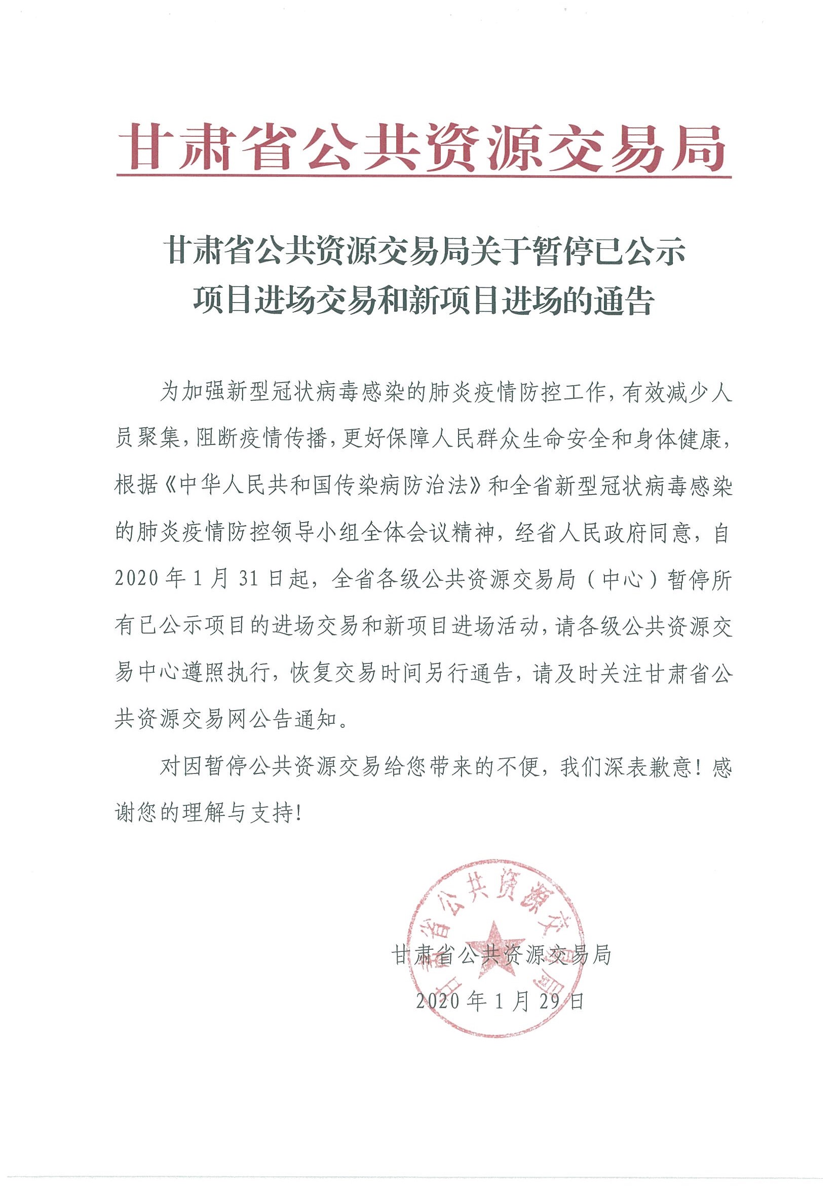 甘肅省公共資源交易局關(guān)于暫停已公示項(xiàng)目進(jìn)場交易和新項(xiàng)目進(jìn)場的通告